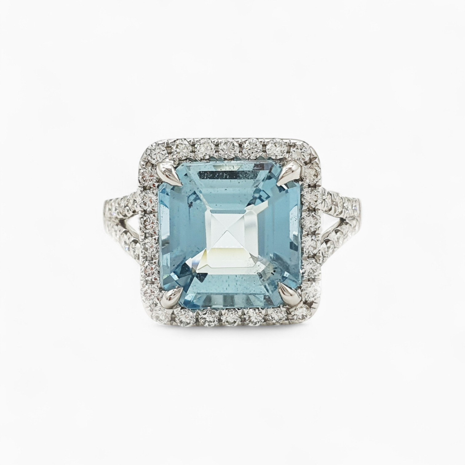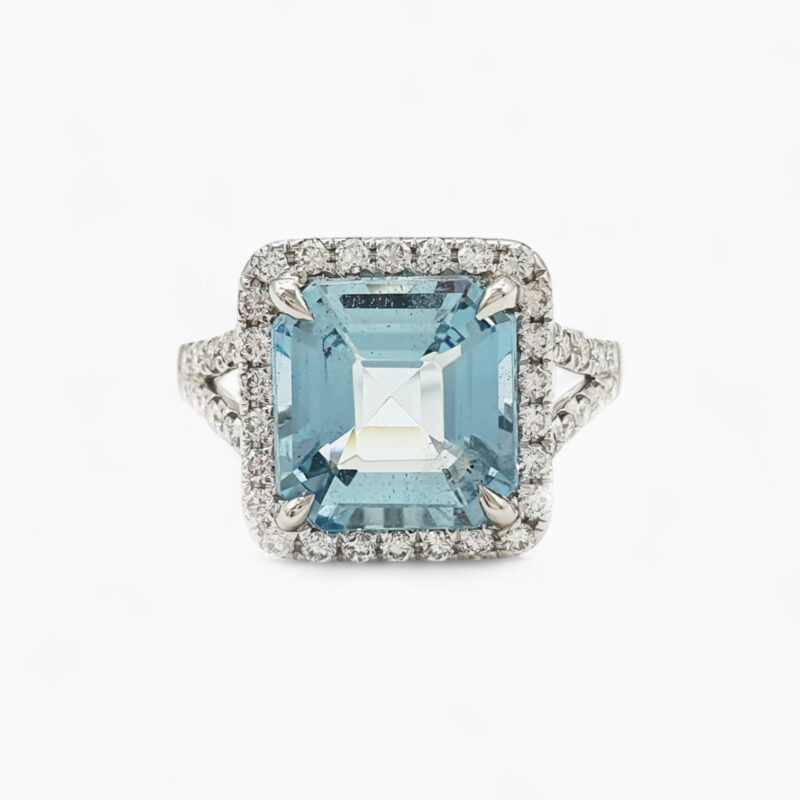 |Complimented by a surrounding halo of diamonds and split shoulders
