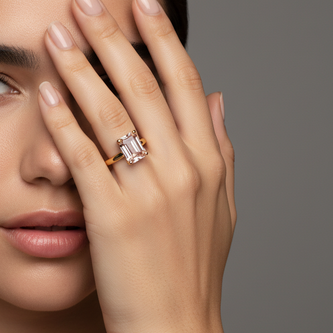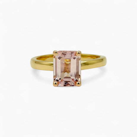 Latin for clear, bright, famous. The clean emerald cut and minimalist gold band add to the luminous and refined elegance of the Morganite.