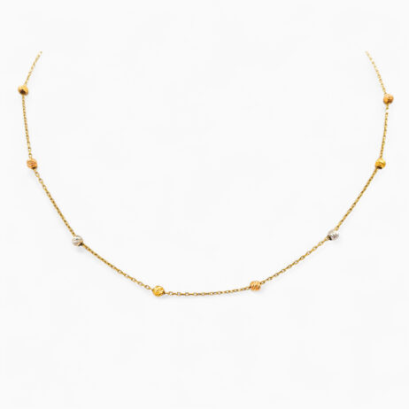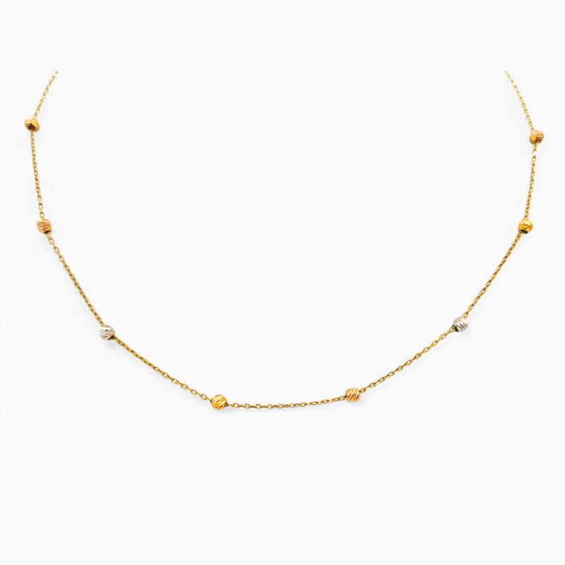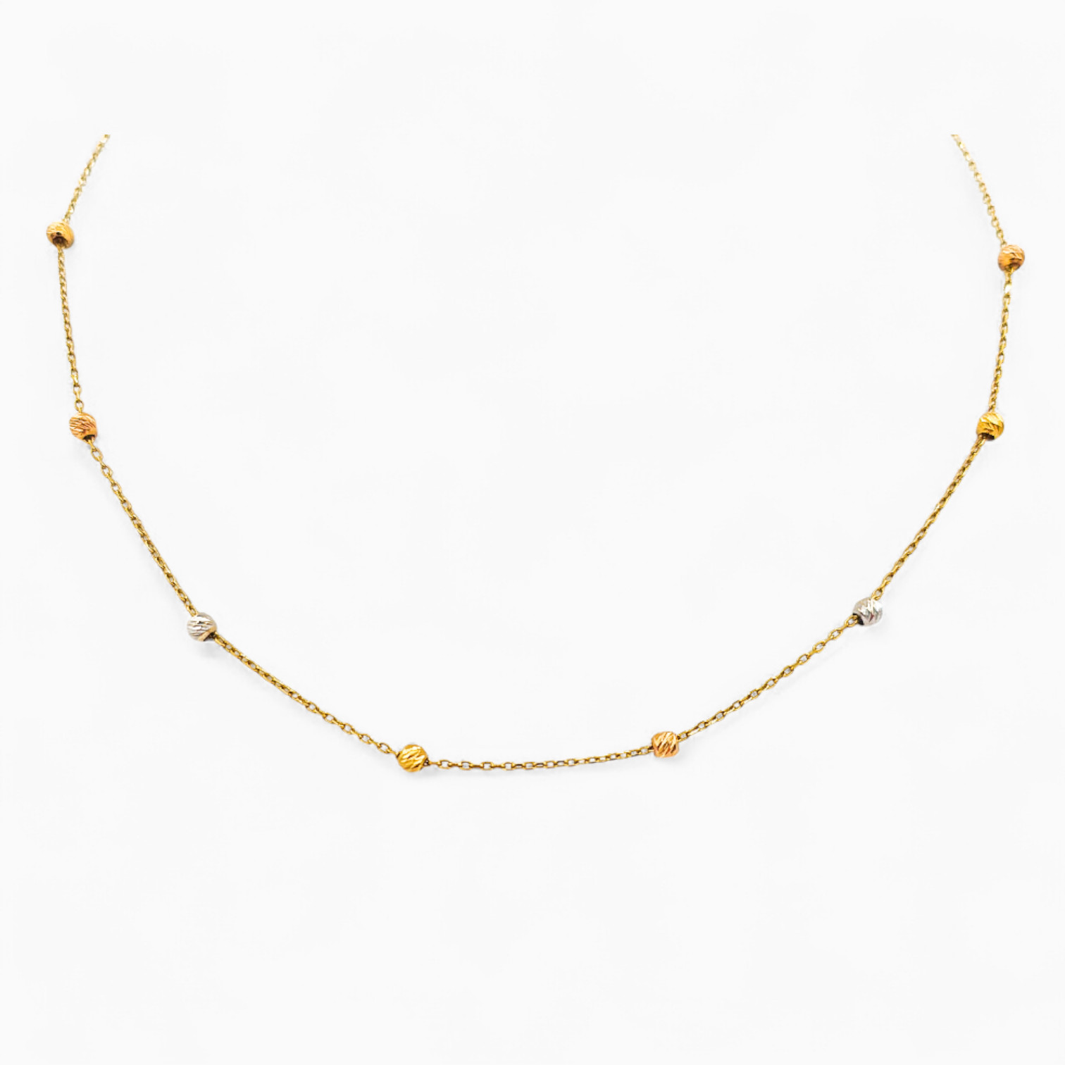 Named Filia — from the Latin root for “thread” — this necklace evokes quiet continuity and grace. Crafted in 18ct yellow gold with a fine cable chain, it features a delicate sequence of polished beads in yellow, white, and rose tones, spaced with intentional rhythm and designed to sit lightly along the collarbone.