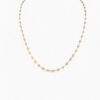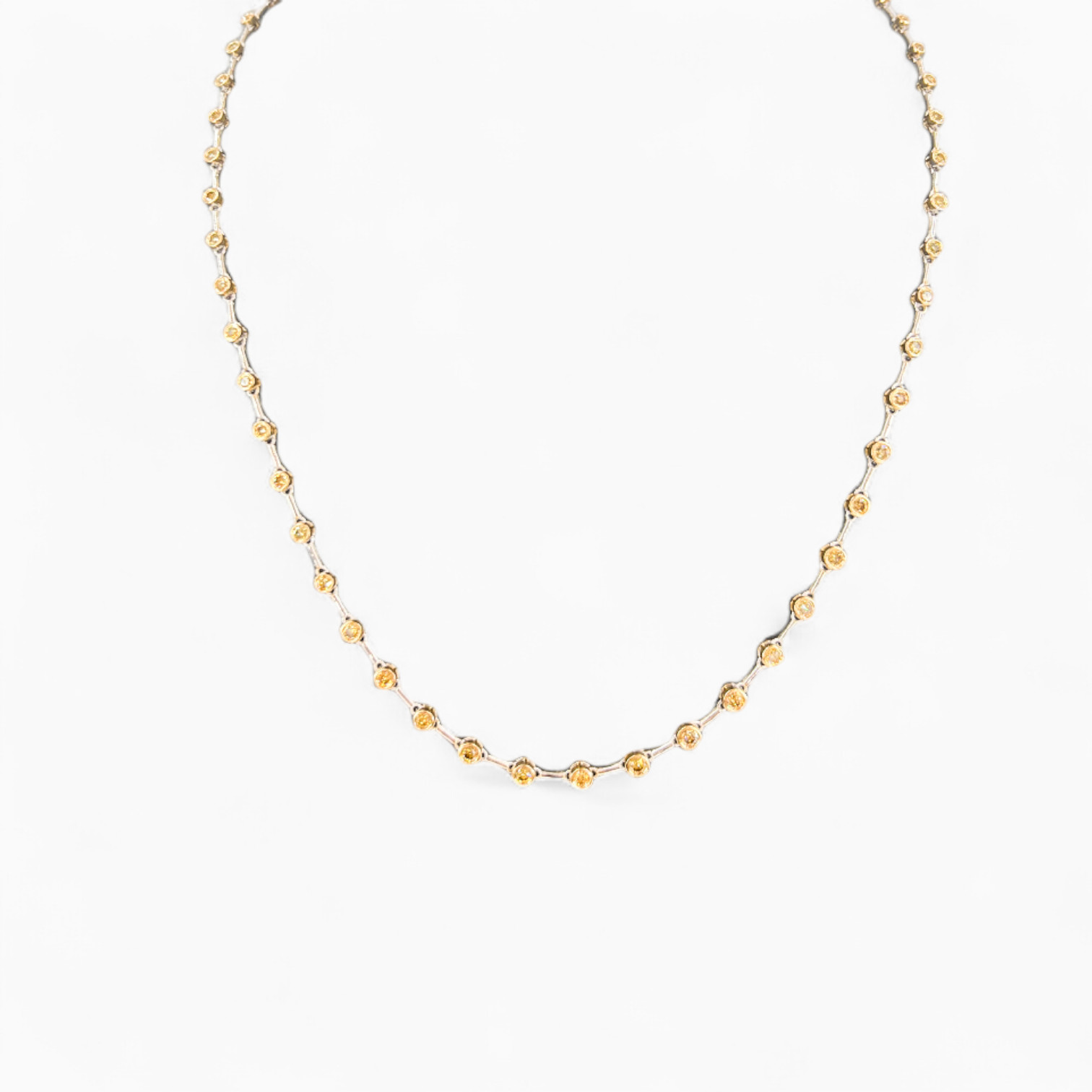 |These diamonds dance along the necklace, separated by graceful white gold bars that add a rhythmic elegance to the piece.